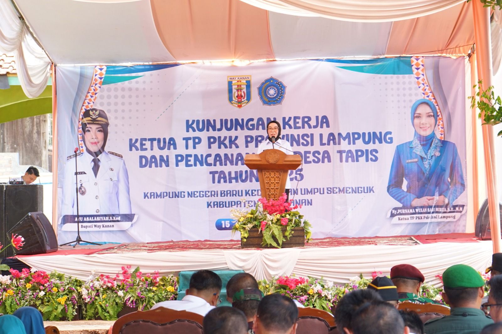 Bupati Way Kanan, Ayu Asalasiyah, S.Ked., beserta jajaran Pemerintah Kabupaten Way Kanan menerima Kunjungan Kerja Ketua Tim Penggerak PKK Provinsi Lampung, Purnama Wulan Sari Mirza, S.E., M.M, beserta jajaran dalam Pencananganan Desa Kesejahteraan Keluarga Untuk Lampung Maju Indonesia Emas (Desa Tapis) di Kabupaten Way Kanan Tahun 2025, di Kampung Negeri Baru, Kecamatan Umpu Semenguk, Rabu (15/10/2025).