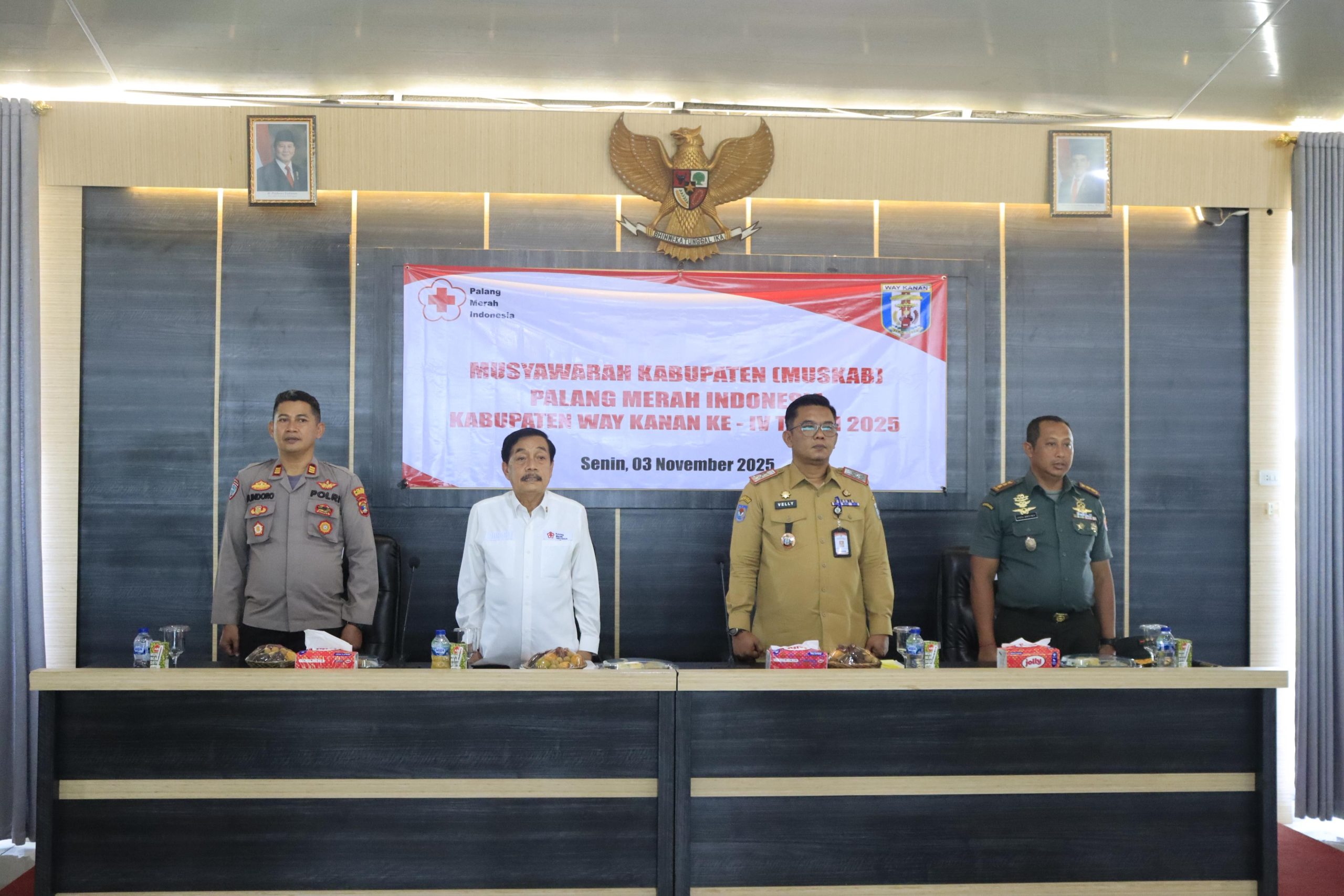 Bupati Way Kanan, Ayu Asalasiyah, S.Ked., diwakili Sekretaris Daerah Kabupaten, Machiavelli Herman Tarmizi, S.STP., M.Si., menghadiri Musyawarah Kabupaten (MUSKAB) Ke-IV Palang Merah Indonesia (PMI) Kabupaten Way Kanan Tahun 2025, yang berlangsung di Ruang Buway Pemuka Pengiran Udik, Senin (03/11/2025).