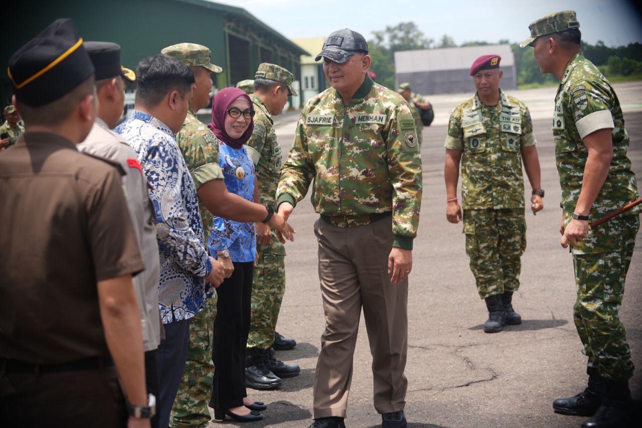 Bupati Way Kanan Ayu Asalasiyah, S.Ked., menghadiri Upacara Penyambutan Kunjungan Kerja Menteri Pertahanan Republik Indonesia, Jenderal TNI (Hor). (Purn.) Sjafrie Sjamsoeddin dan Wakil Panglima TNI, Jenderal TNI Tanyo Budi Ravita beserta rombongan di Lanudad Gatot Soebroto, Kecamatan Way Tuba, Kamis (26/02/2026).