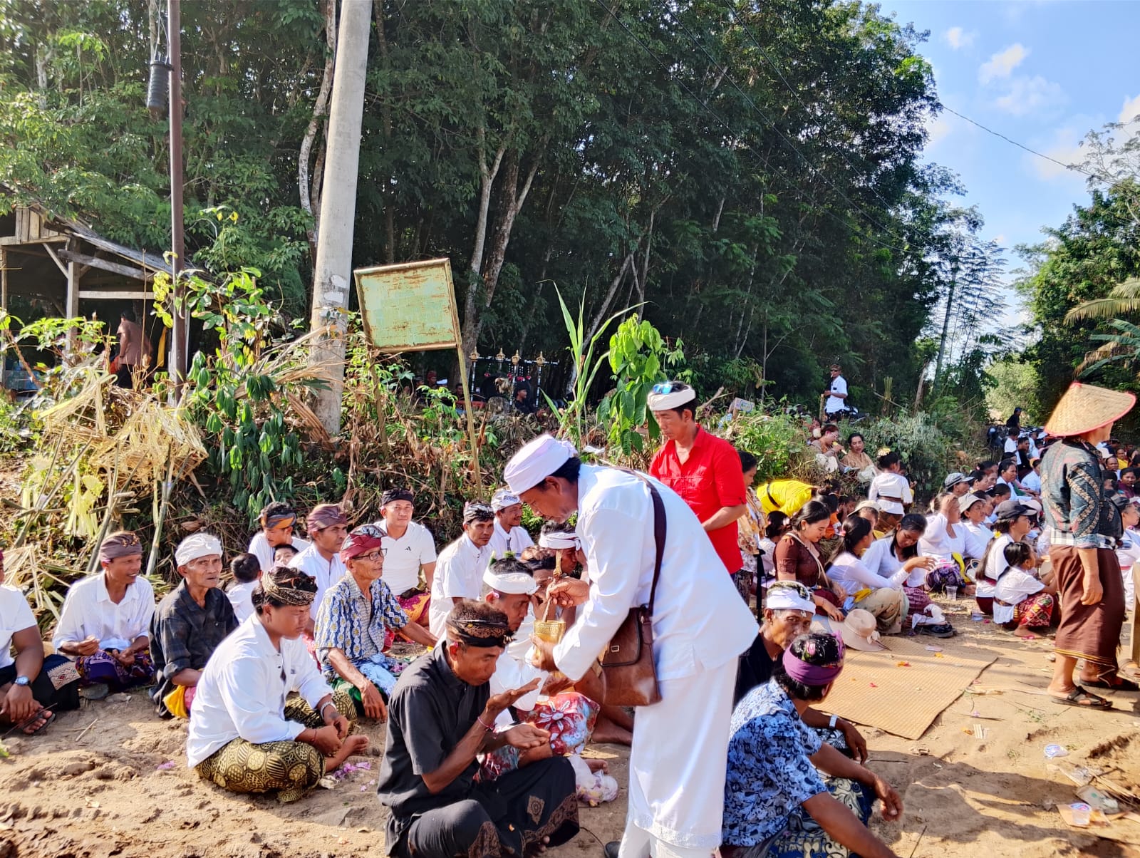 Ketua adat Bali Kampung Aji Permai, Yuli Salam, bersama Mangku Rian dan delapan Pecalang tampak memimpin jalannya prosesi dengan penuh khidmat. Kehadiran aparat dari Polsek Gedung Aji turut memastikan kegiatan berjalan aman dan kondusif.