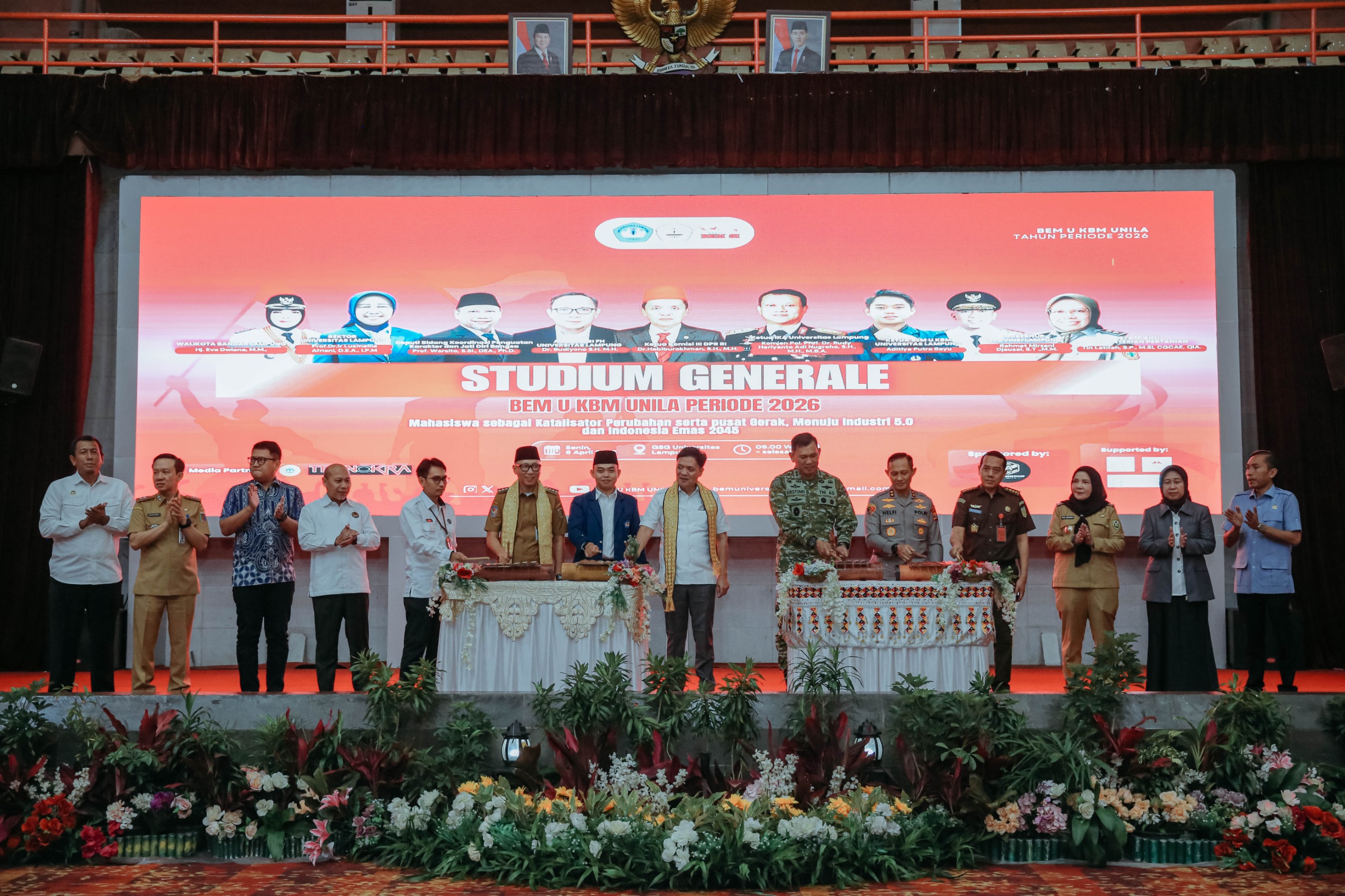 BANDARLAMPUNG – Gubernur Lampung Rahmat Mirzani Djausal menghadiri Acara Stadium General dan Pelantikan Pengurus BEM U KBM Universitas Lampung (Unila) periode 2026 yang digelar di Gedung Serbaguna (GSG) Unila, Senin (6/4/2026). Acara ini turut dihadiri oleh Ketua Komisi III DPR RI, Dr. Habiburokhman, S.H., M.H., serta jajaran Forum Komunikasi Pimpinan Daerah (Forkopimda).
