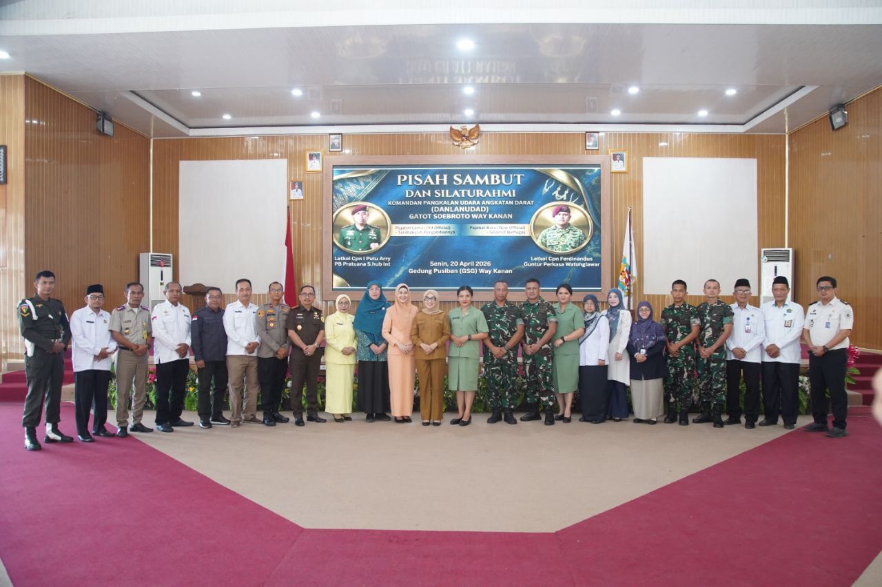 Pemerintah Kabupaten Way Kanan menggelar Acara Pisah Sambut dan Silaturahmi Komandan Lanudad Gatot Soebroto Way Tuba di Gedung Pusiban Pemkab Way Kanan, Senin (20/04/2026).